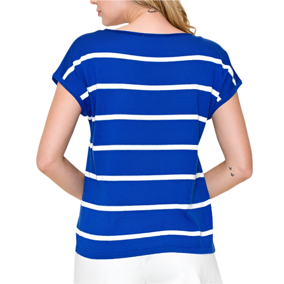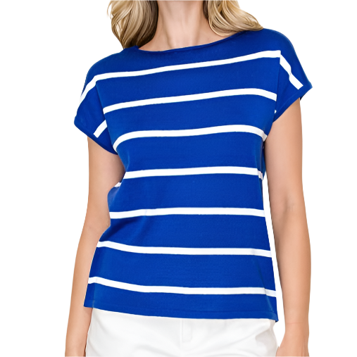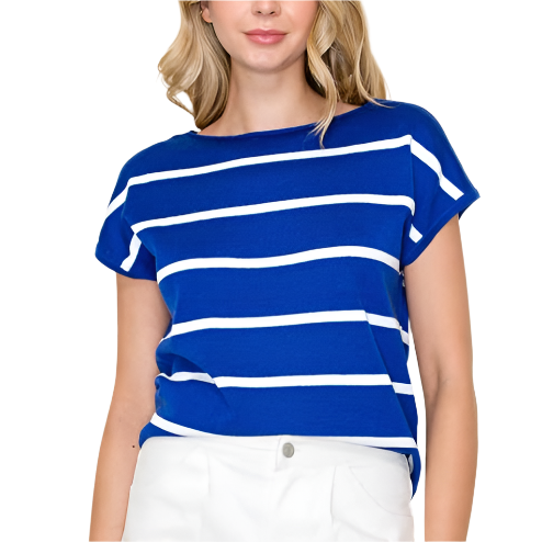 We love this striped pullover sweater top featuring a wide crew neck and short sleeves in Royal.