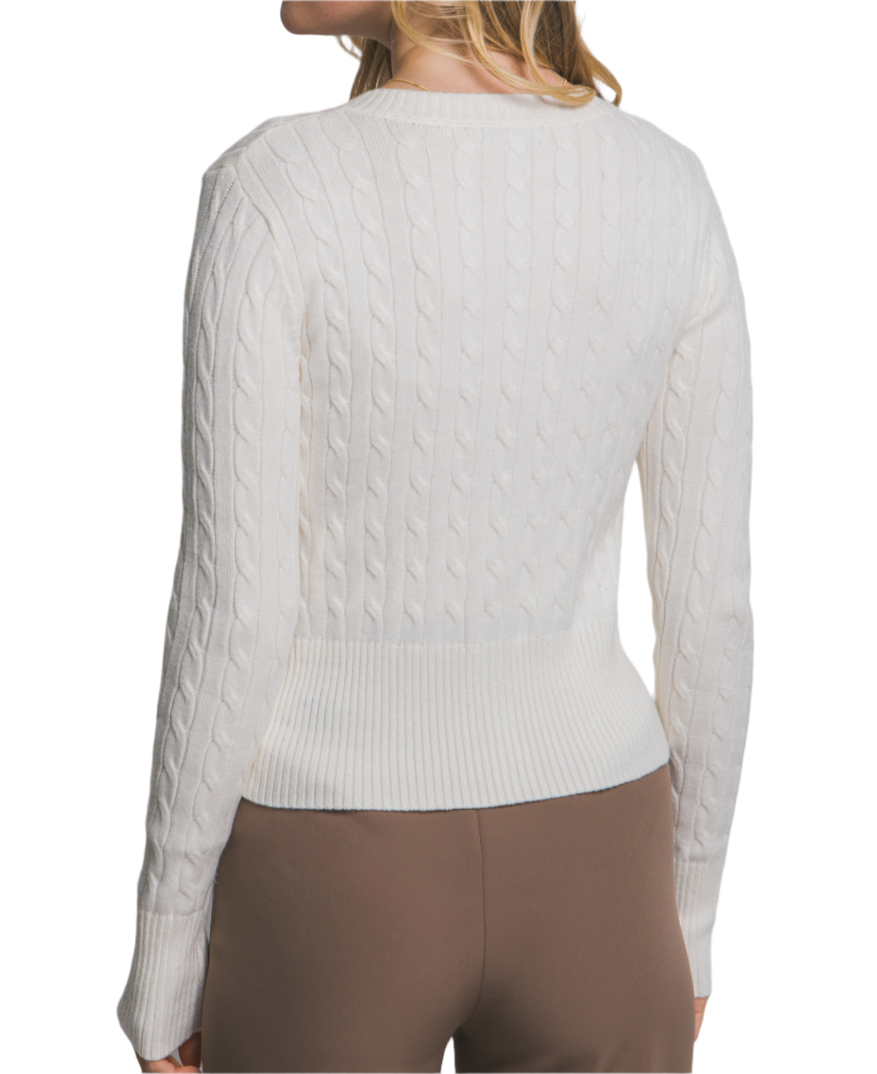 Featuring a classic ivory cable knit pattern, this cardigan offers a button-down front and long sleeves for a stylish, cozy look.