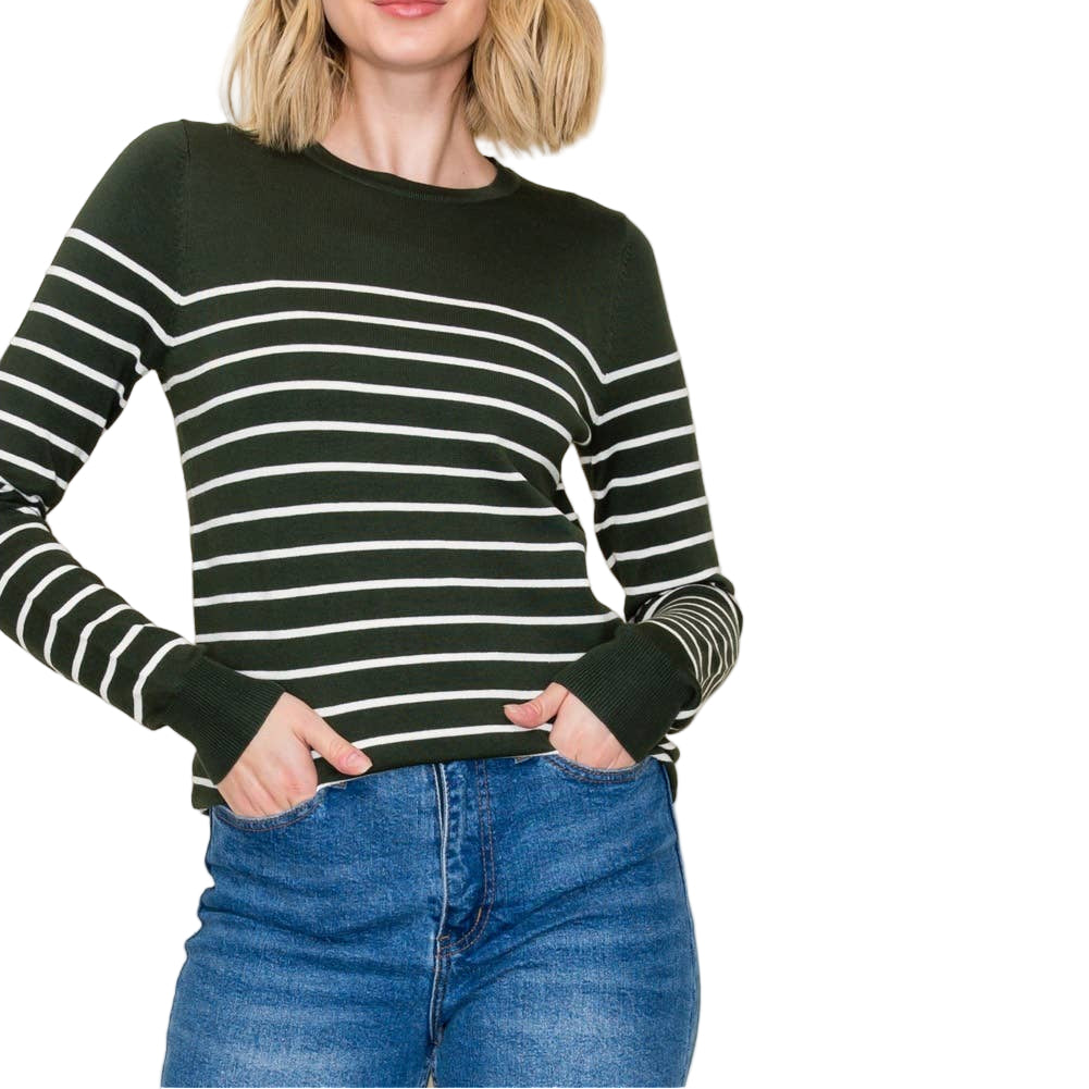 This pullover sweater in forest green features a classic crew neck, long sleeves, and a distinctive block stripe design, offering a stylish yet cozy addition to your wardrobe.