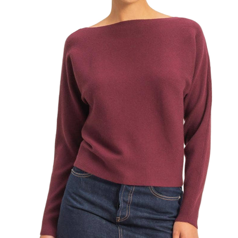 Enjoy comfort with this ribbed sweater, which has a stylish boat neckline that offers a sophisticated touch. Ideal for a chic, effortless autumn look, pair it with high-waisted denim or a flowy skirt and keep accessories minimal to emphasize the neckline.