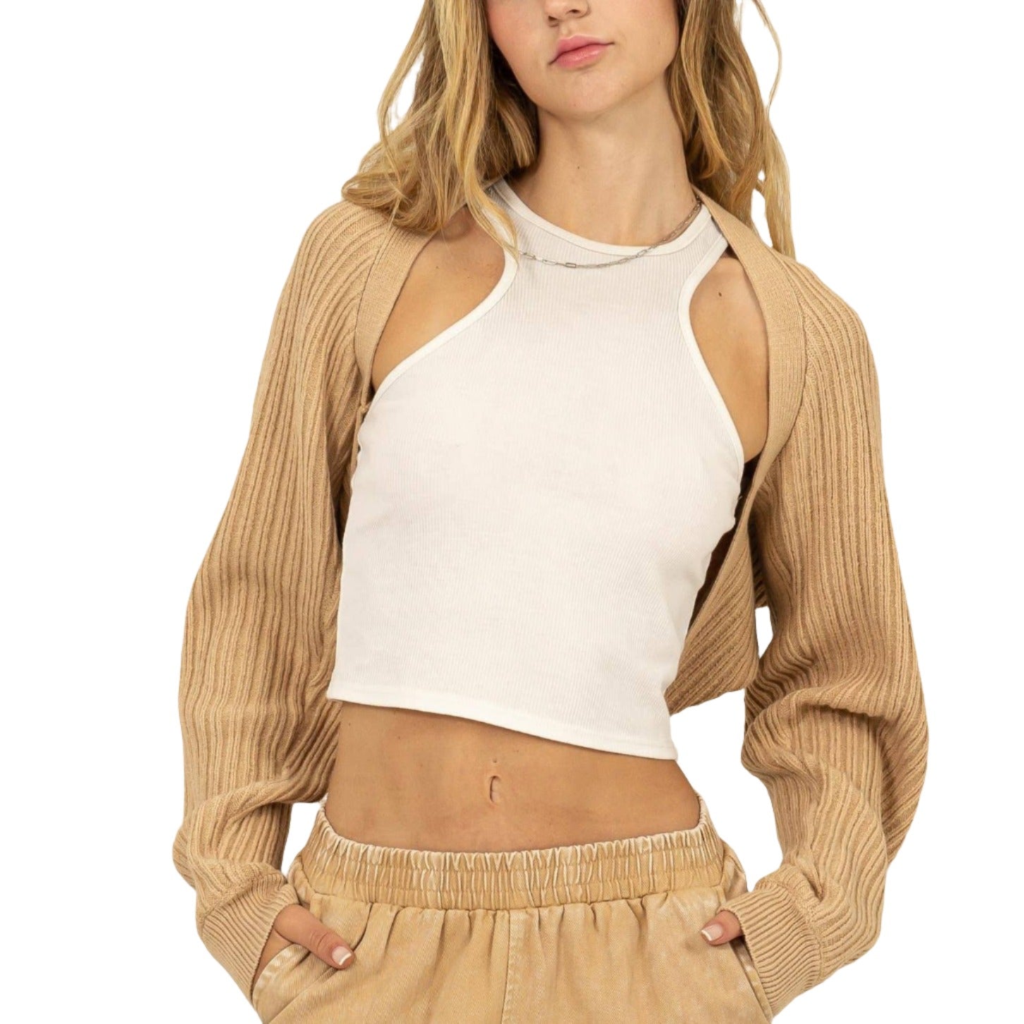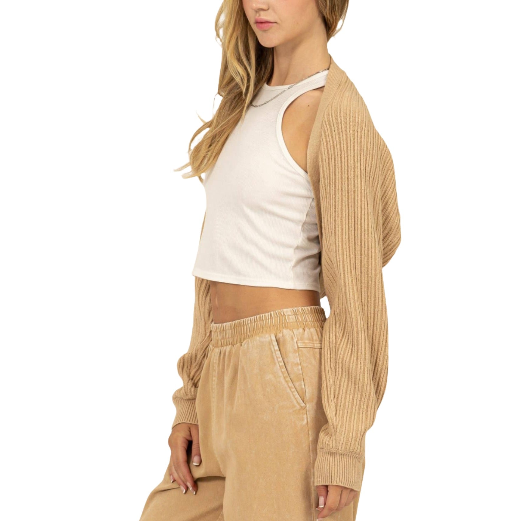 This ribbed knit bolero cardigan is a stylish and adaptable layering essential. Crafted from soft ribbed knit fabric, it offers both comfort and warmth. The open-front style paired with long sleeves brings a fashionable edge to any outfit. Perfect for layering during changing seasons or when you want a little extra coverage.