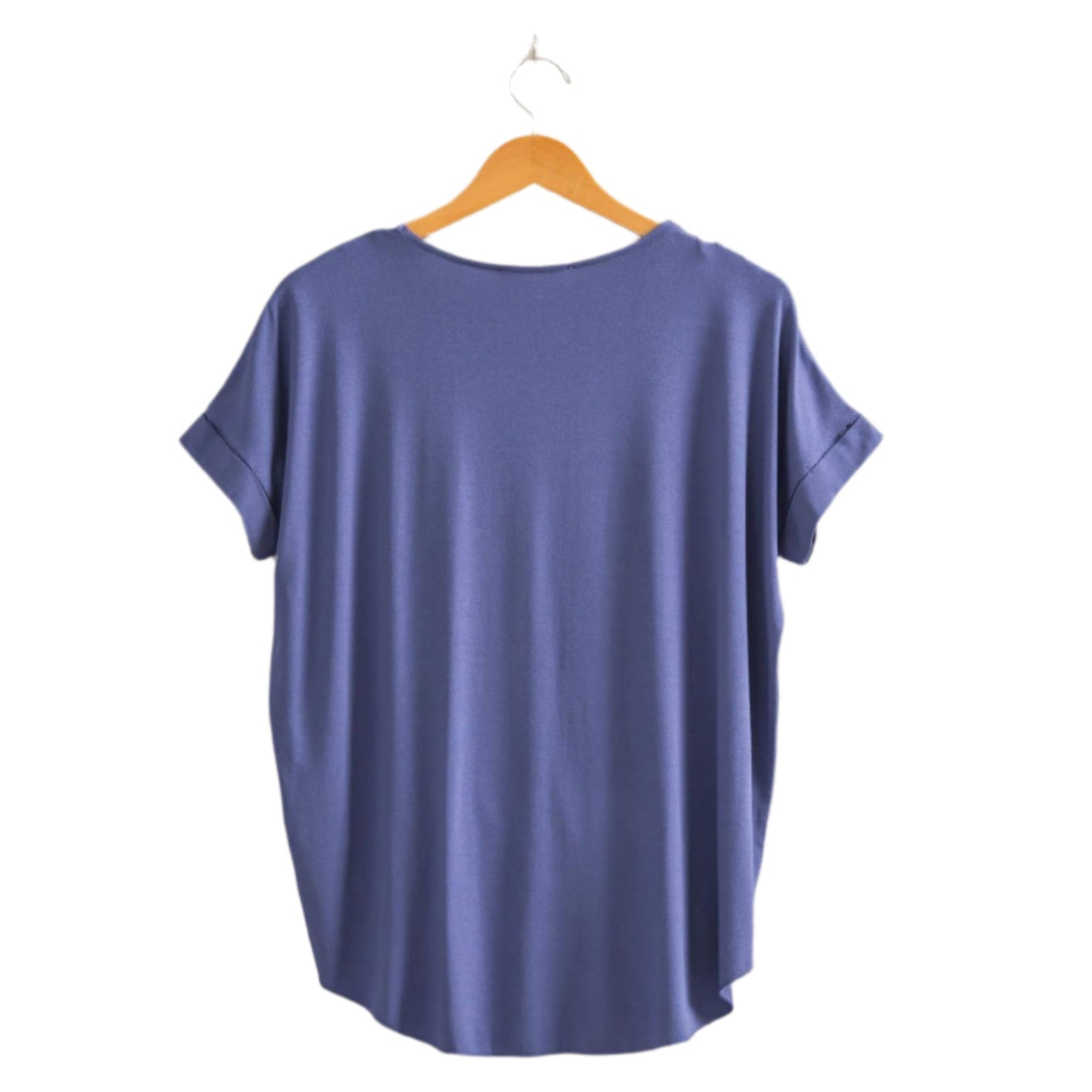 This top showcases essential features: a V neckline, short sleeves, and a wide, swingy bodice. Its relaxed silhouette finishes with a rounded hem. Pair it with denim bottoms for a stylish, effortless outfit. Made from 95% rayon and 5% spandex.