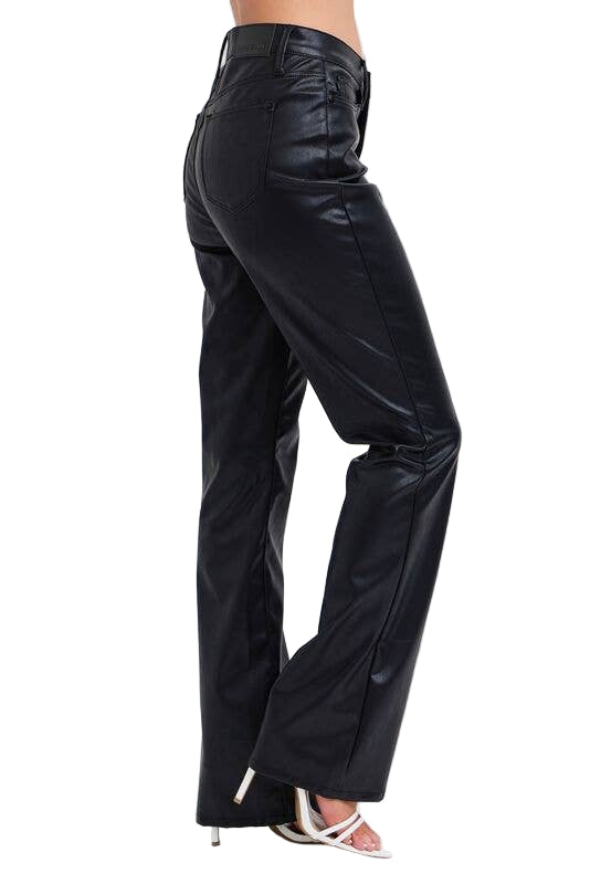 Sleek faux leather bootcut jeans with a high waist and tummy control for a flattering silhouette. The smooth finish and modern bootcut leg make these versatile for any season. Hand wash only.