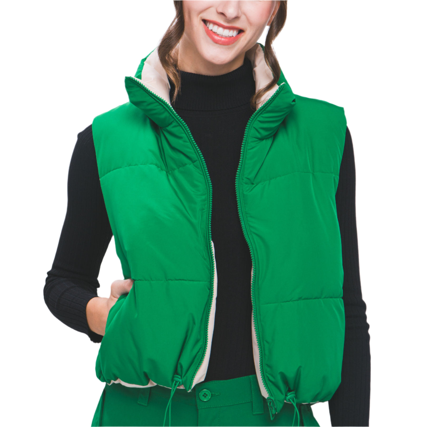 This French Green Puffer Vest is crafted from 100% polyester and features a solid woven design that is fully reversible for versatile styling options.