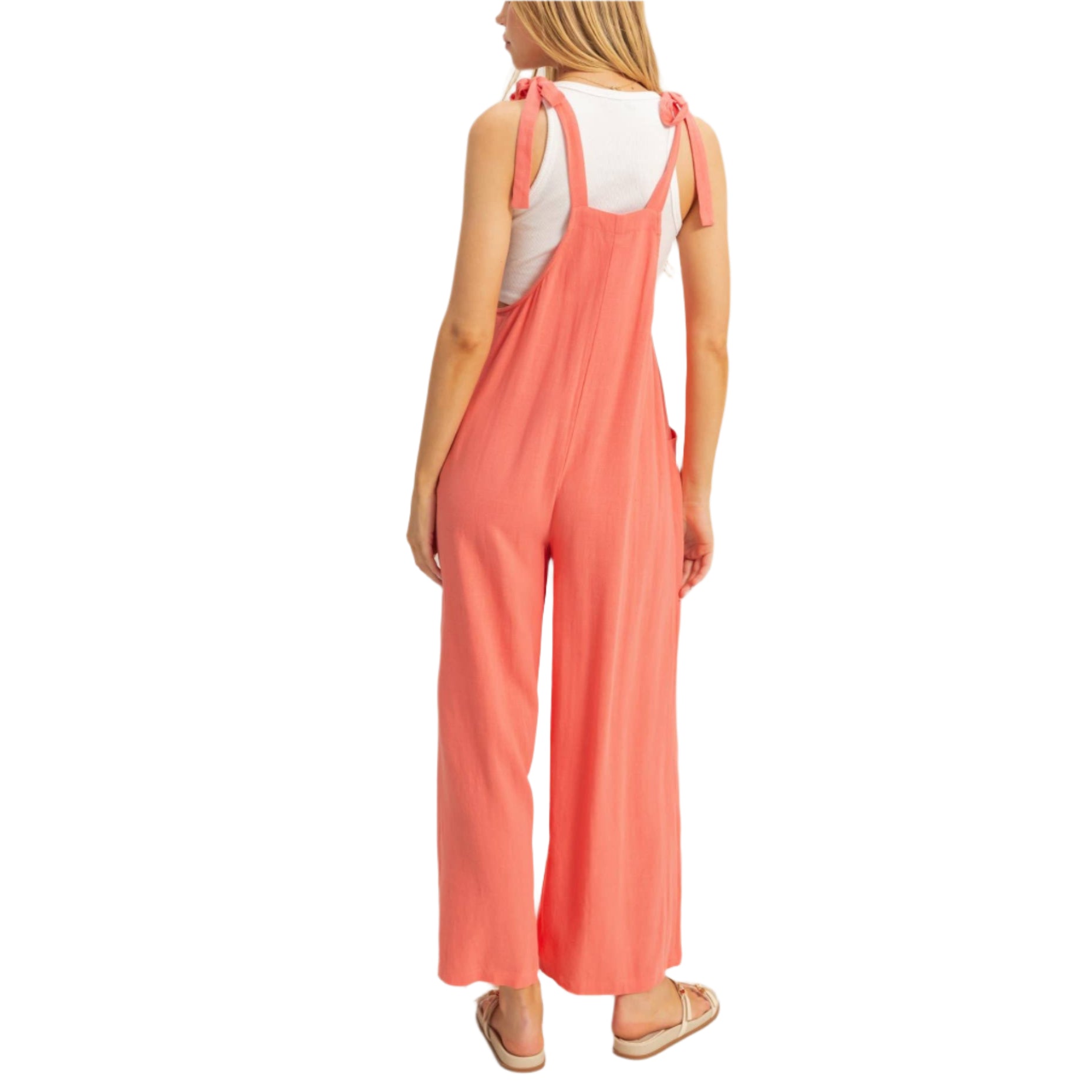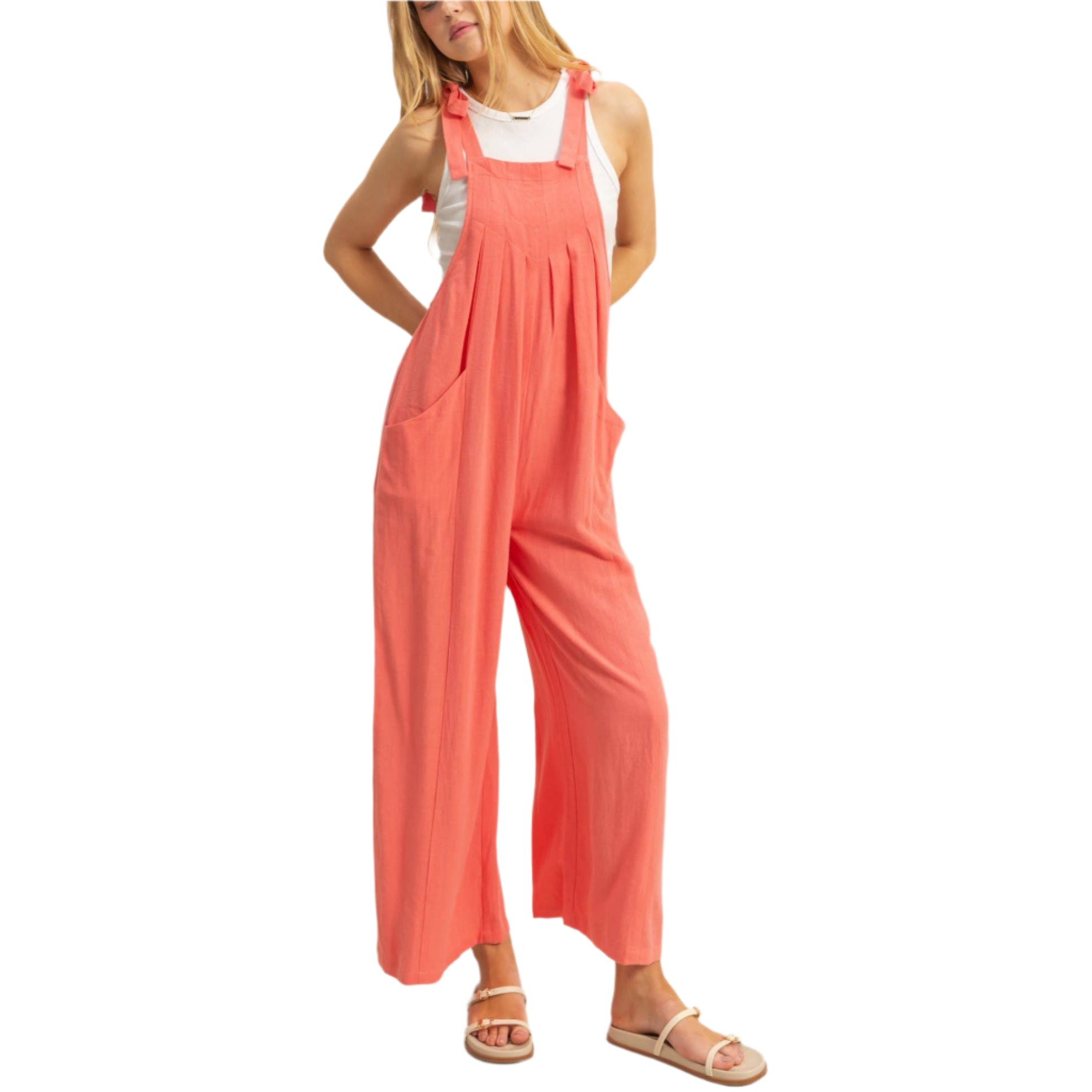 Get ready for a stylish day in the sun with this comfy jumpsuit! Made with rayon linen, it features self-tie shoulder straps and a pleated waist for a flowy, fashionable look.