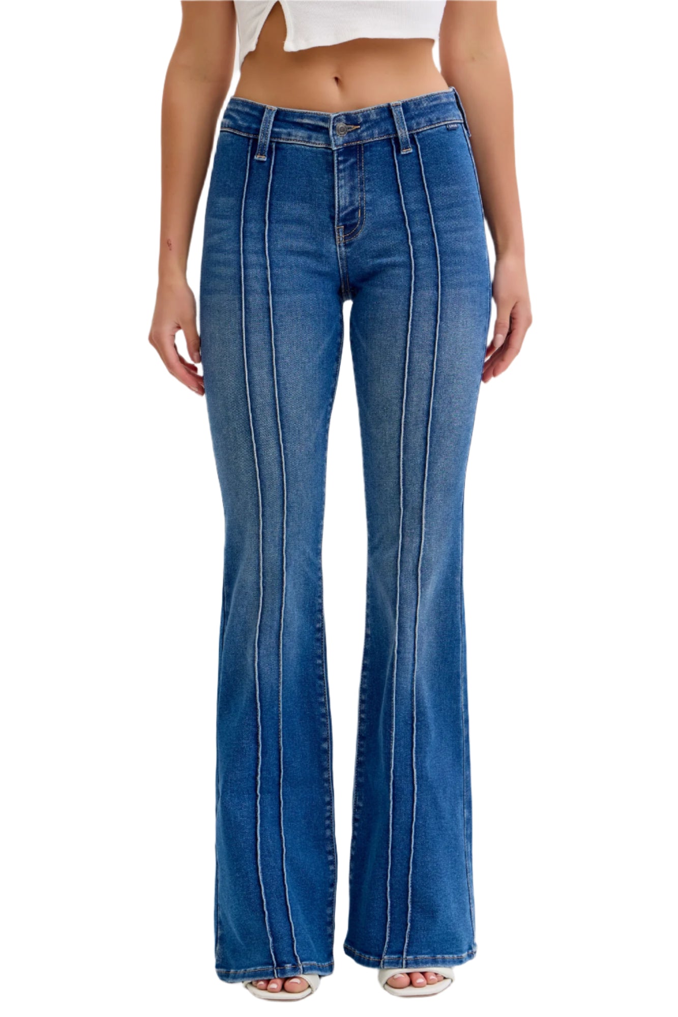 Featuring a mid-rise silhouette and a chic flare leg with pintuck seam detailing, these medium-wash denim jeans.