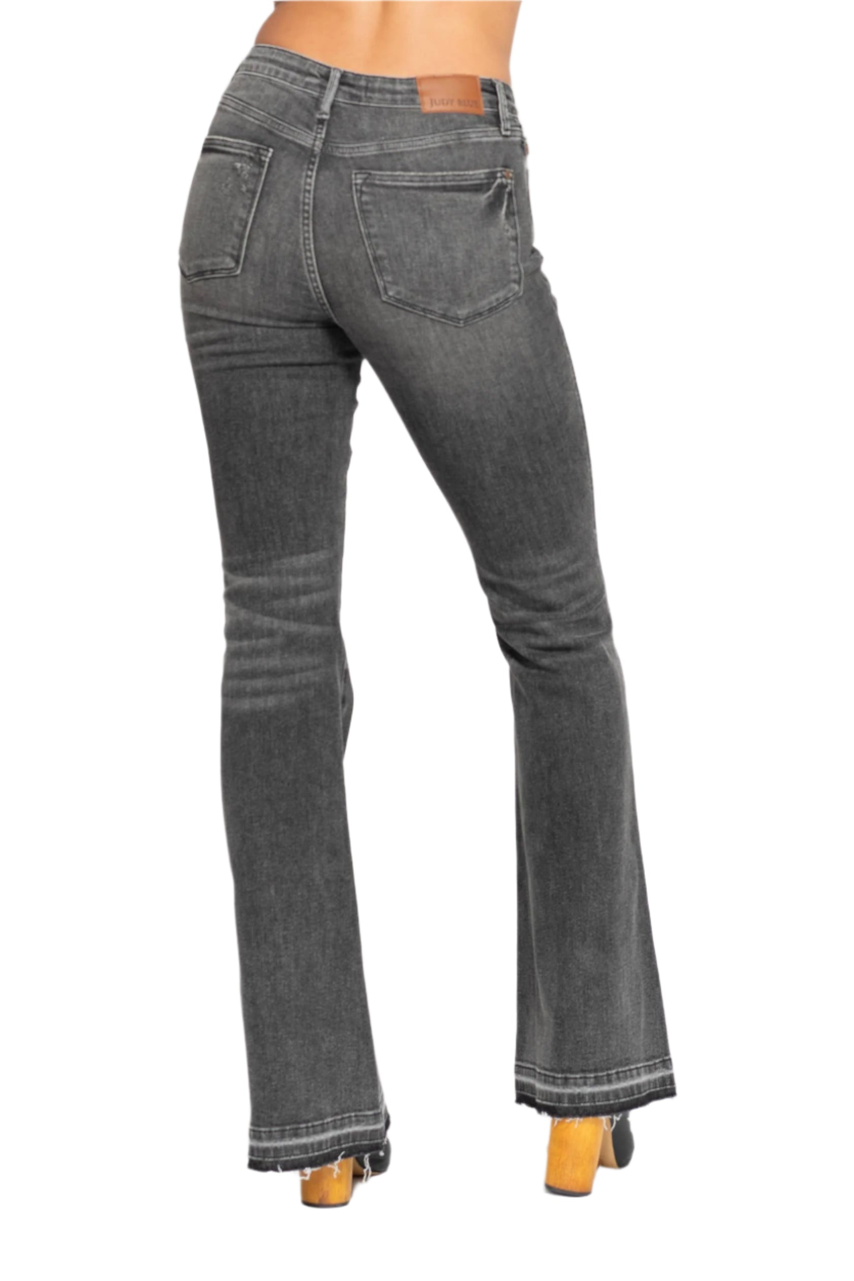 Mid-rise Judy Blue flare jeans in washed gray with tummy control and a release hem detail.