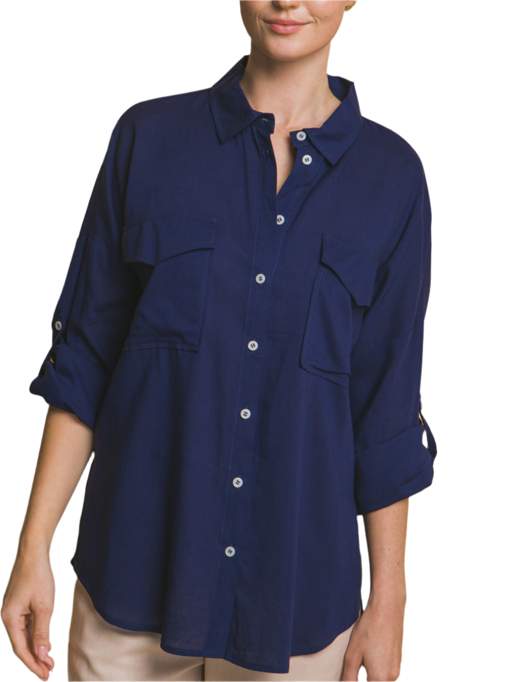 - Lovely long sleeves featuring roll-and-button cuffs to adjust to your preference.