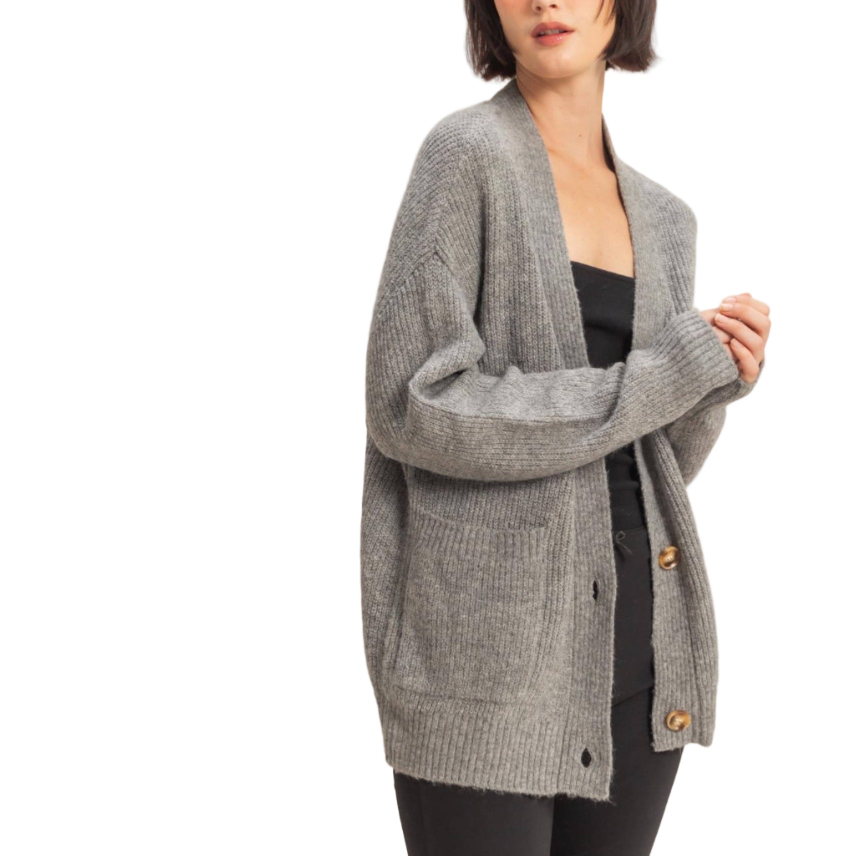 This Heather Gray Sweater Cardigan showcases an oversized ribbed knit design with a relaxed fit and a deep V-neckline. It includes large buttons and roomy front pockets, combining comfort with practical style.