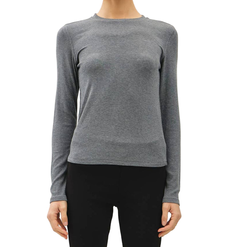 Ribbed, round neck knit top with long sleeves, featuring a pullover style. A versatile layering essential.