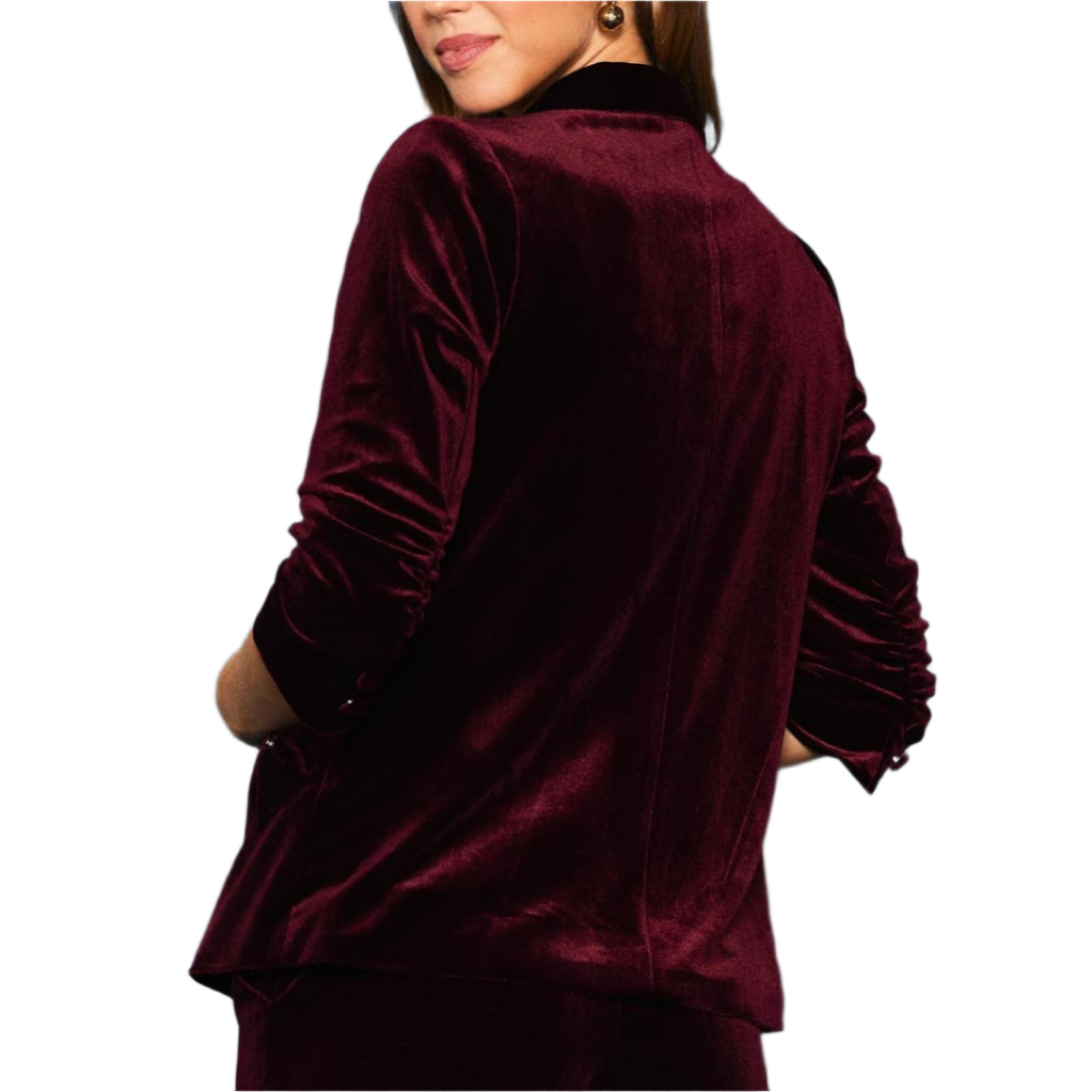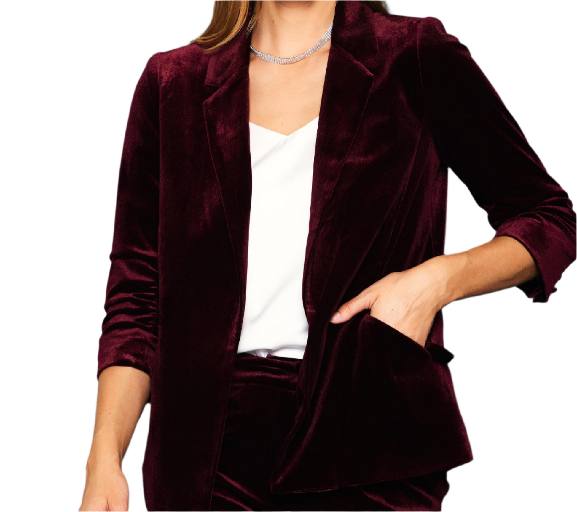 This open-front blazer features soft velvet fabric and ruched sleeves for a stylish, luxurious touch. Pair it with a sleek top and the coordinating velvet pants for a chic outfit perfect for date nights or elegant dinners with friends.