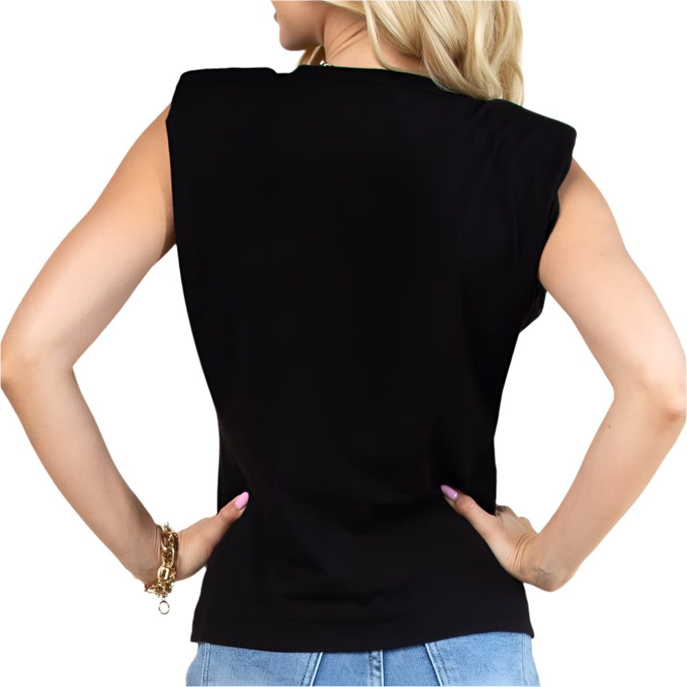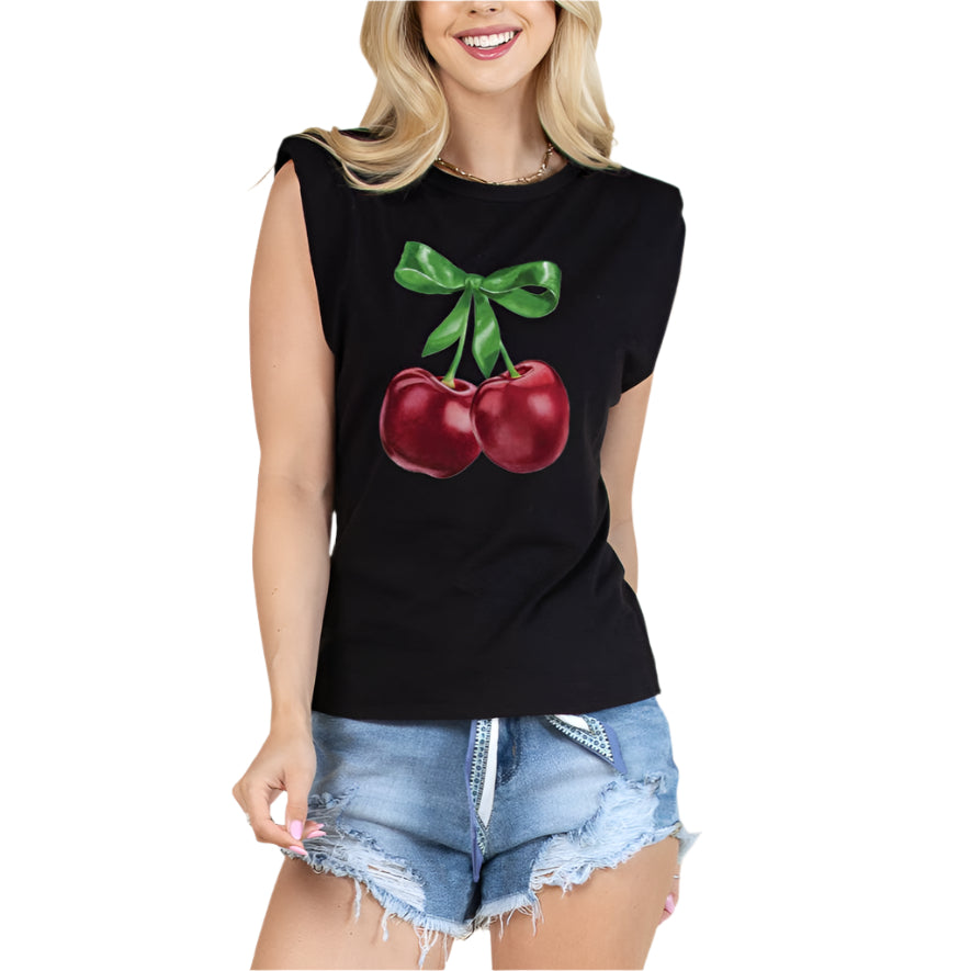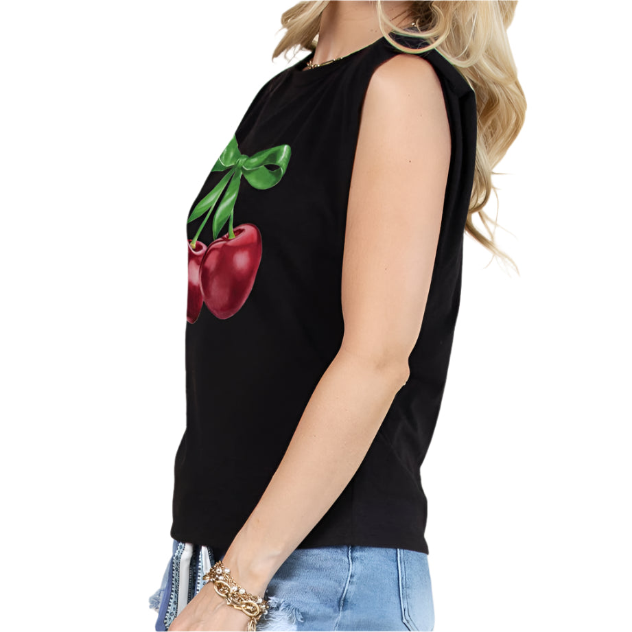 The "Ma Chere" cherry print adds a fashionable touch to this black Shireen muscle tank top. It is made of cotton fabric and features a relaxed fit and round neck, with trendy shoulder padding.